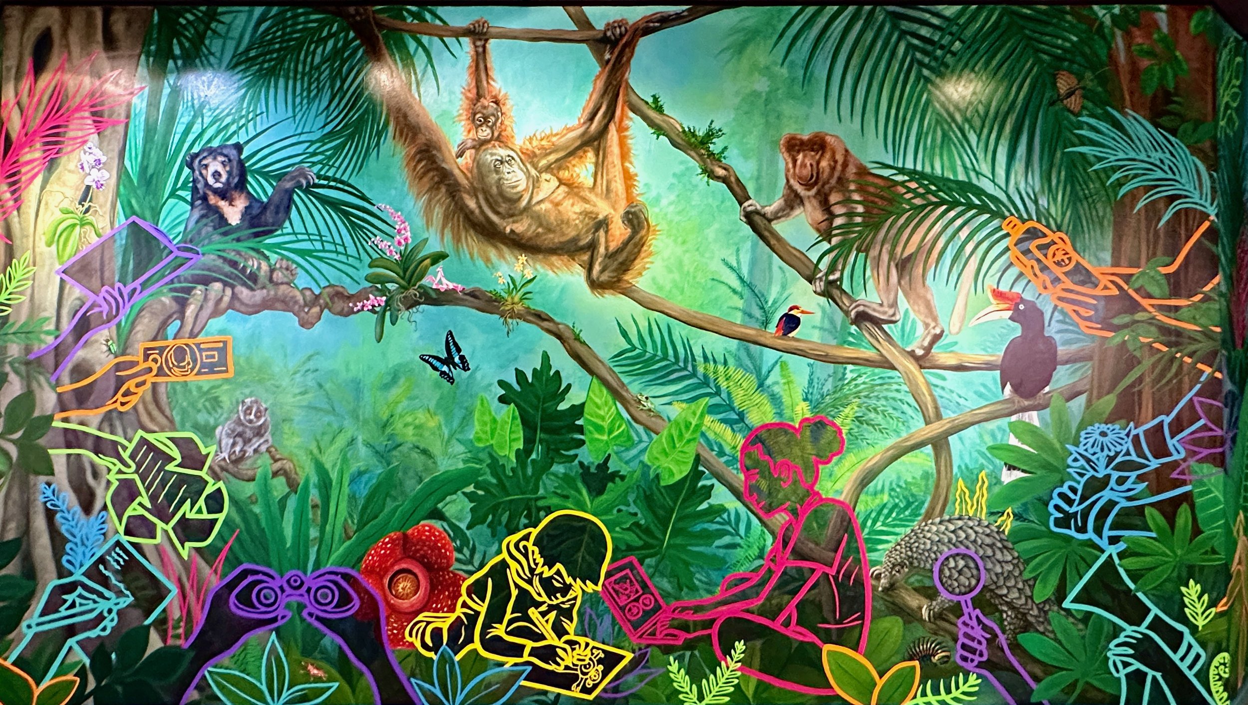 The Primate House Mural was an exciting collaboration between Amy Zaremba and Alicia Rheal. The design highlights select creatures and plant life of a Bornean Rainforest overlayed with vibrant representations of actions we can all take to help protect and preserve that precious wildlife. Kids from the Zoo after school program as well as Little Picassos smooshed paint and learned about these calls to action as they created handprint pledges that adorn a separate installation. This engagement with the mural is ongoing as new groups of kids are introduced to the actions and asked to add their own hand to a growing collection of pledges in the Primate House.